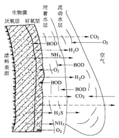 由于生物膜的吸附作用,在膜的表面存在一個(gè)很薄的附著水層。污水流過生物膜時(shí),有機(jī)物經(jīng)附著水層向膜內(nèi)擴(kuò)散。膜內(nèi)微生物在氧的參與下,對(duì)有機(jī)物進(jìn)行分解和機(jī)體新陳代謝。代謝產(chǎn)物沿底物相反的方向擴(kuò)散,從生物膜傳遞返回液相和空氣中。在整個(gè)生物膜系統(tǒng)中,微生物不斷吸收有機(jī)營養(yǎng)成分,污水不斷得到凈化,而生物膜也不斷生長(zhǎng),一些老化的生物膜會(huì)自動(dòng)脫落,從而保持了生物膜的良好活性。