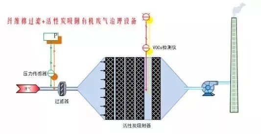 揮發(fā)性有機氣體先經(jīng)過一定的前處理裝置,再經(jīng)過濾器進一步去除尾氣中的雜質,以保證這些雜質不占用活性碳纖維的孔隙,影響活性碳纖維的吸附效率和使用壽命;過濾后的尾氣經(jīng)風機引入吸附設備。