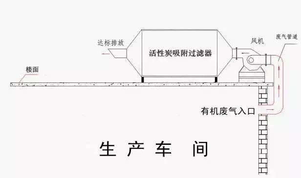 車間有機廢氣通過吸氣罩收集,在排風機作用下,經(jīng)過管道輸送進入干式過濾器,再進入活性炭吸附裝置,有機污染物被活性炭吸附,凈化后的氣體經(jīng)風機增壓后達標排放;钚蕴课斤柡秃螅垖I(yè)廠家再生后回用。