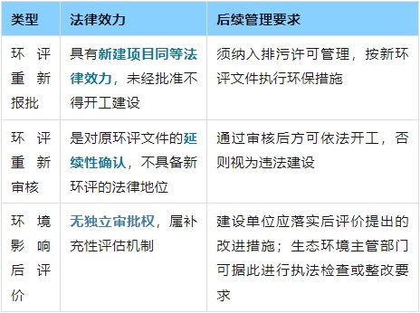 在建設(shè)項(xiàng)目環(huán)境影響評價(jià)管理過程中,環(huán)評重新報(bào)批、重新審核和環(huán)境影響后評價(jià)是三種不同的制度安排,它們在定義、適用情形、審批流程和要求、以及法律效力和后續(xù)管理要求方面存在顯著差異。以下將結(jié)合相關(guān)法規(guī)文件內(nèi)容逐一進(jìn)行比較分析: